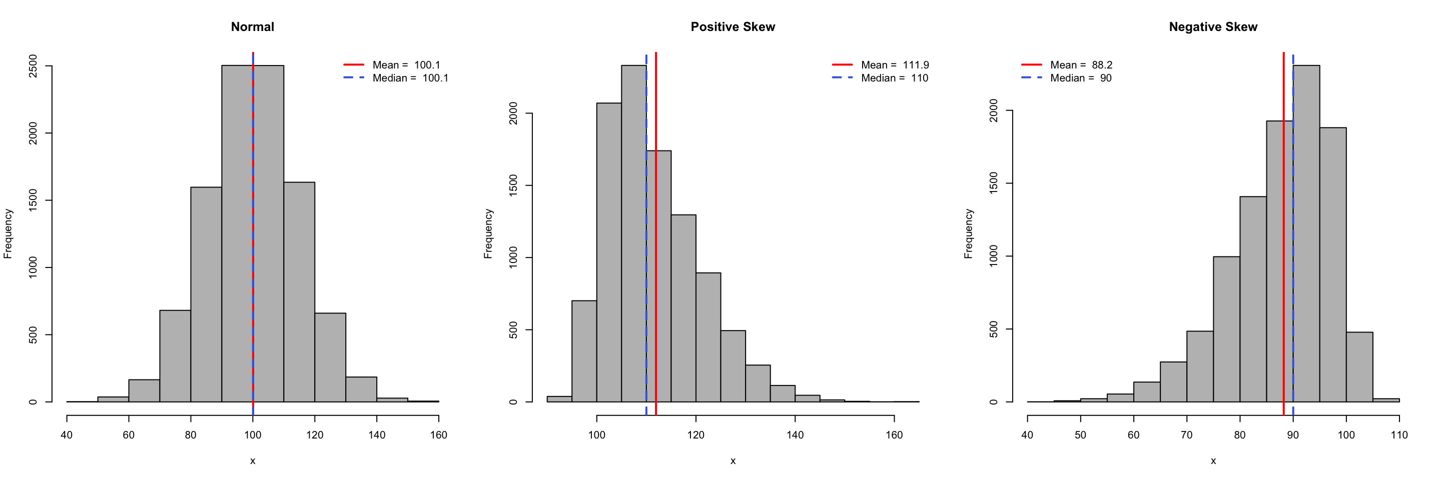 When appropriate, the mean is the preferred measure of central tendency for most applications. This is because we can do the most with the mean mathematically. Recall from what we learned about the characterisitcs of the mean that we can meaninfully add, subtract, multiply and divide means. But this depends on the type of variable we are dealing with. Generally speaking, the mean is useful for numeric variables that are symmetric in shape, preferably normally distributed. When data are skewed (i.e. not symmetrical), the mean can be adversely impacted by the skewness, being pulled toward the skewed tail moreso than the median. Therefore with skewed distributions the median can be a better measure of central tendency. The median is also less susceptable to the influence of outliers.